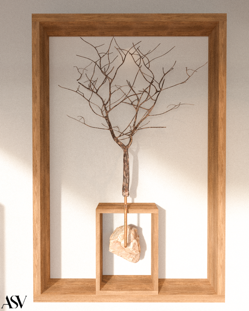Cada cuadro refleja un balance visual y conceptual, integrando materiales naturales que evocan calidez y conexión con el entorno, junto con elementos industriales que aportan modernidad y robustez. Estas piezas no solo cumplen una función decorativa, sino que también añaden un carácter único a los espacios, convirtiéndose en elementos centrales de diseño dentro del proyecto.